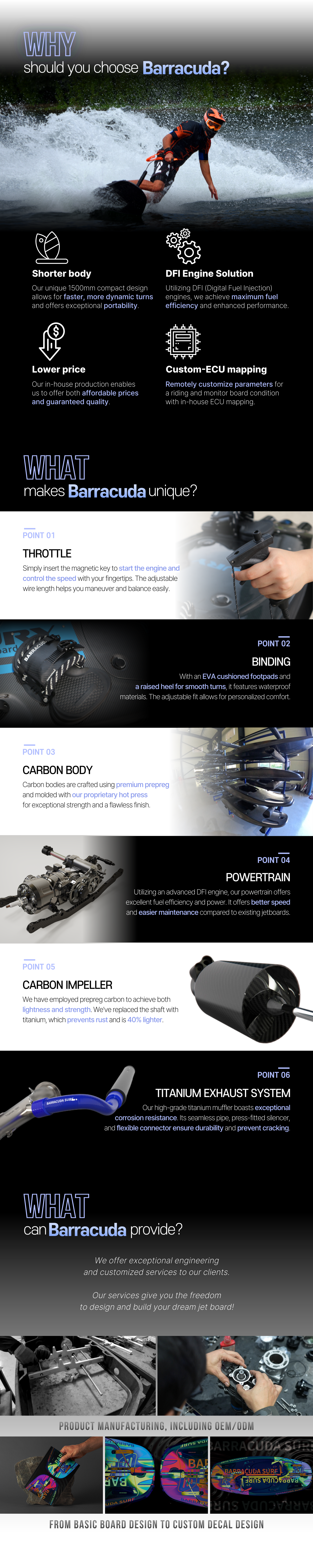 It has a top speed of 64 km/h and boasts a short radius of rotation, which is unique to the short body. Devised through many years of real riding, Barracuda Surf’s curved design gives riders the ultimate fun of gliding on the water. Our self-designed injector-type DFI engine provides the optimized startability, stability of the engine, and an instant response. Application of our own titanium exhaust also promises the maximum output for your fun.